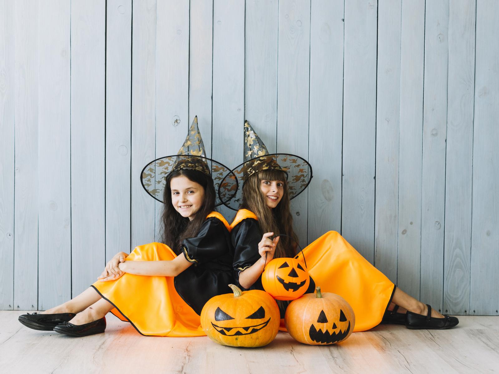 Wallpaper Two little girls with pumpkin in Halloween costumes