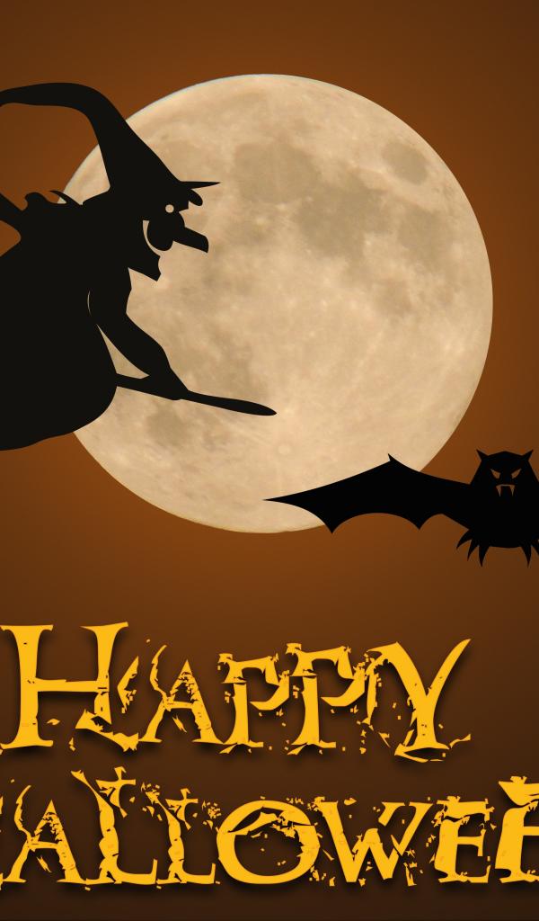 Wallpaper Scary inscription Happy Halloween on a wooden plate with candles