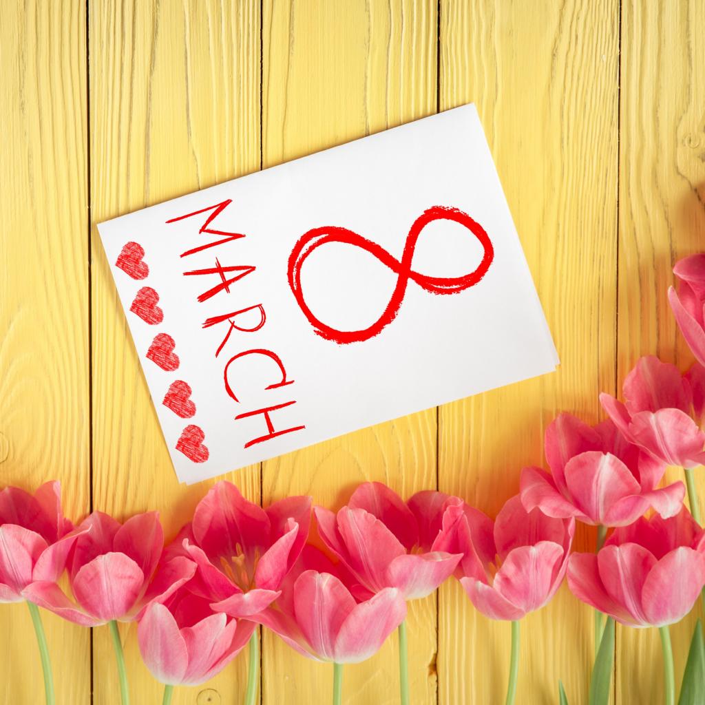 Wallpaper Festive card with tulips on International Women`s Day on March 8
