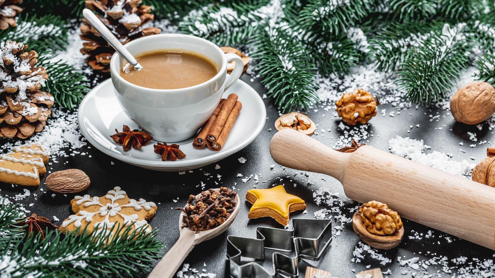 Wallpaper A cup of hot cocoa on the table with fir branches and nuts