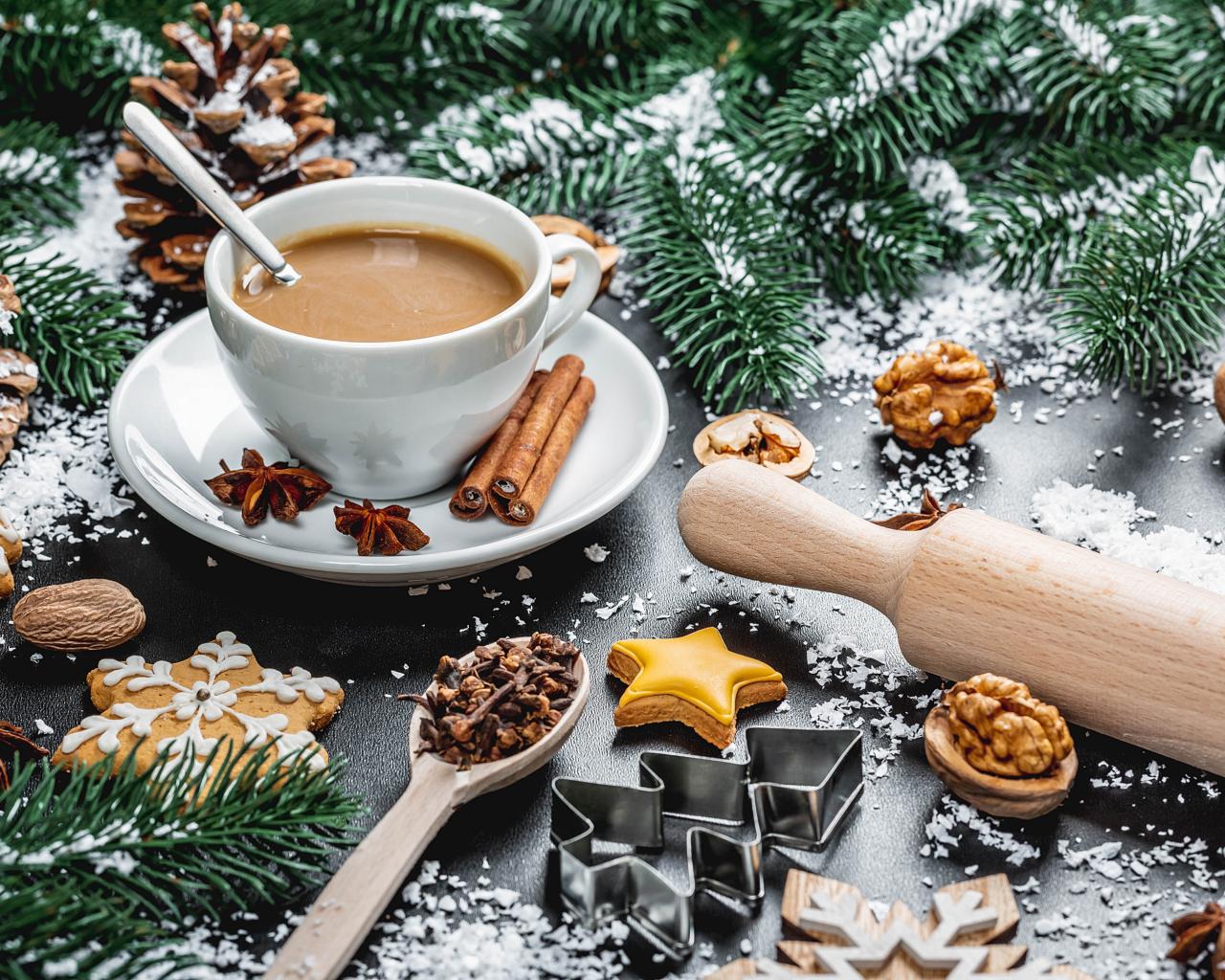 Wallpaper A cup of hot cocoa on the table with fir branches and nuts