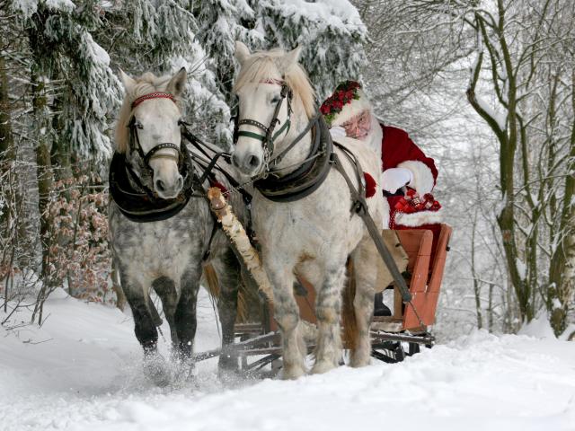 Wallpaper Santa Claus in a sleigh rides on a snowy forest