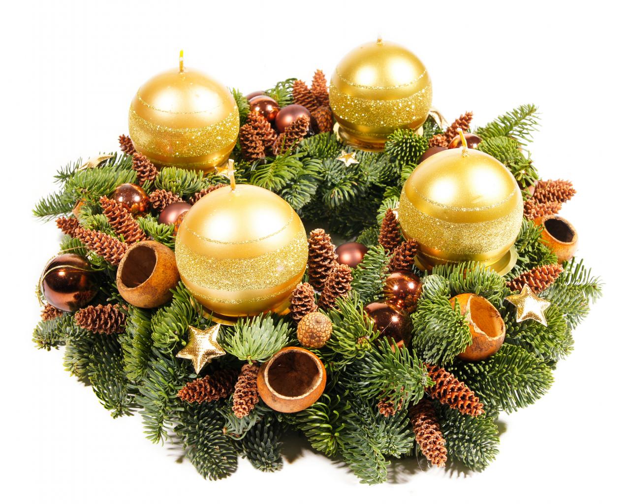 Wallpaper Christmas wreath with gold candles on a white background