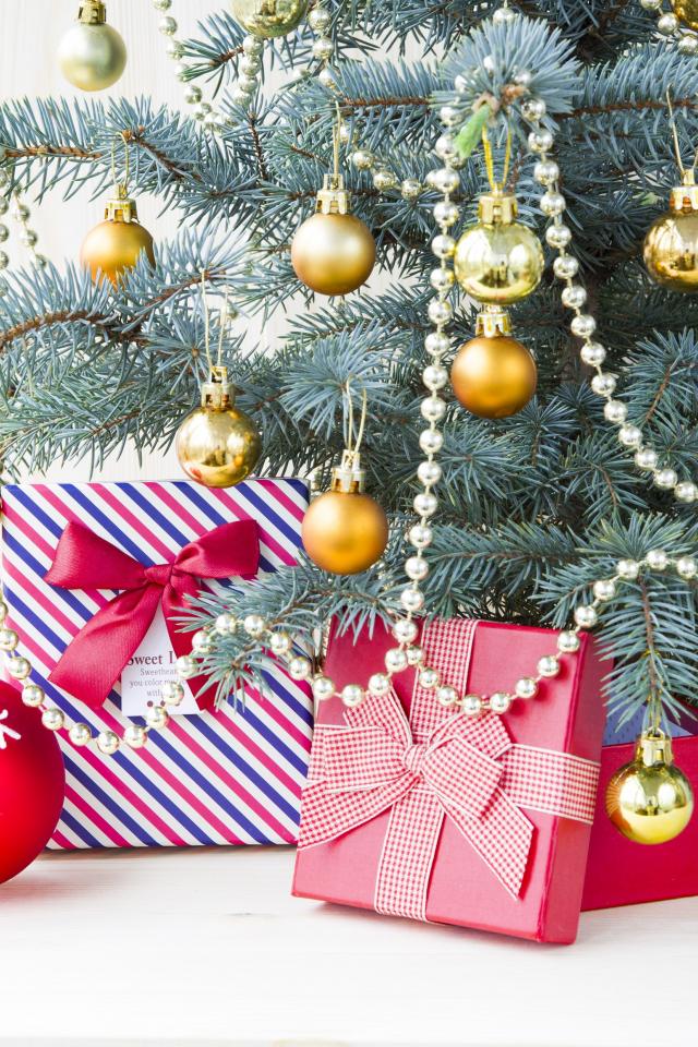 Wallpaper Gifts under a green fancy tree with golden balls