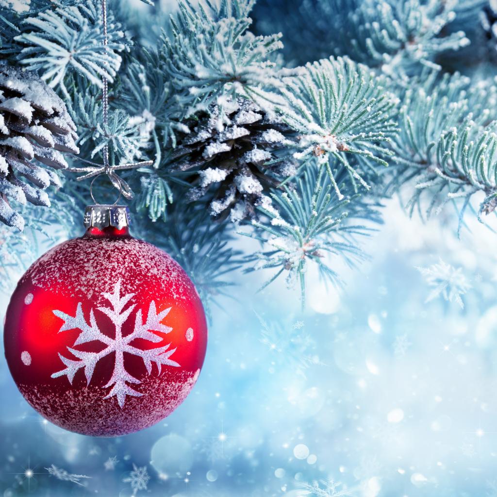 Wallpaper Beautiful Christmas ball on a frost-covered spruce branch