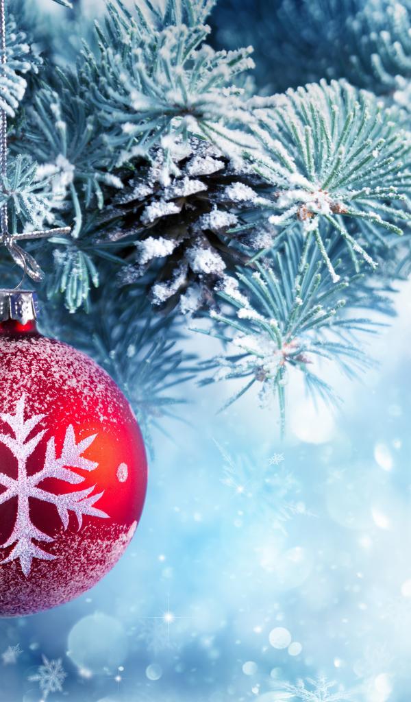 Wallpaper Beautiful Christmas ball on a frost-covered spruce branch