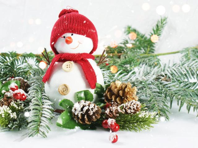 Wallpaper Snowman made of threads on a table with a cup and Christmas tree branches