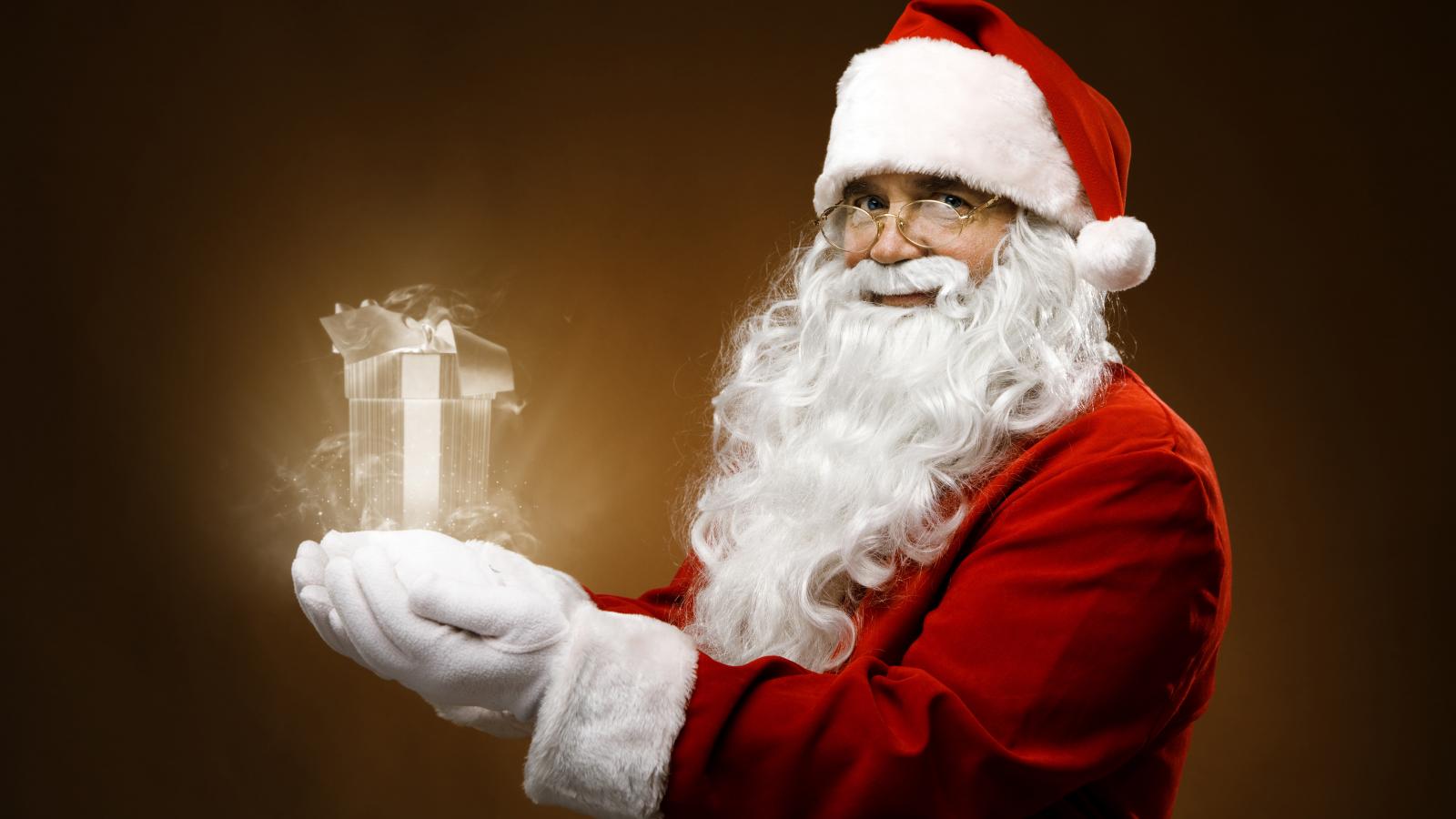 Wallpaper Santa Claus with a gift in his hands on a brown background