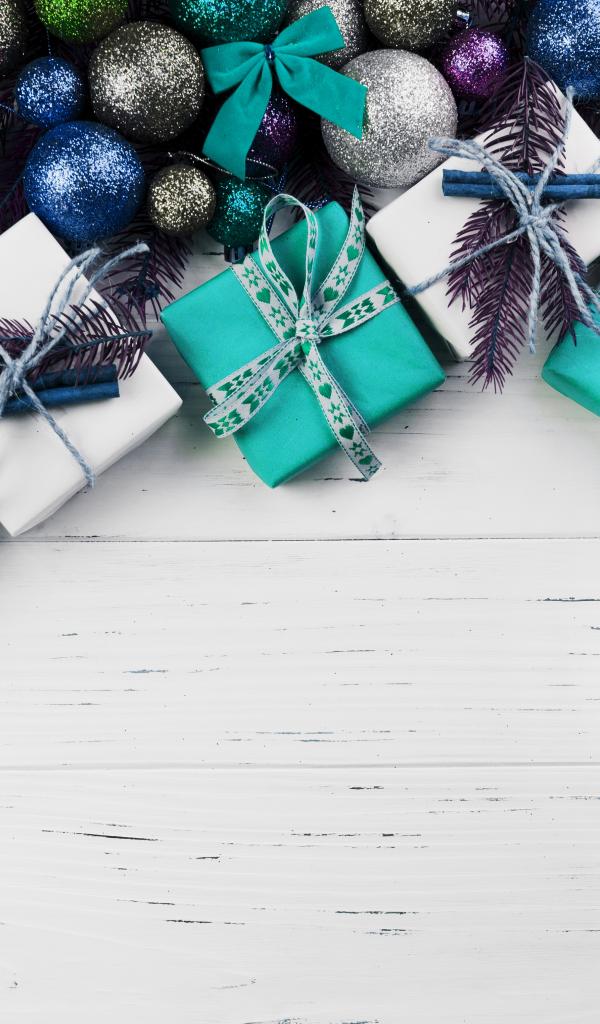 » Wallpaper Gifts and christmas balls on wooden background, template