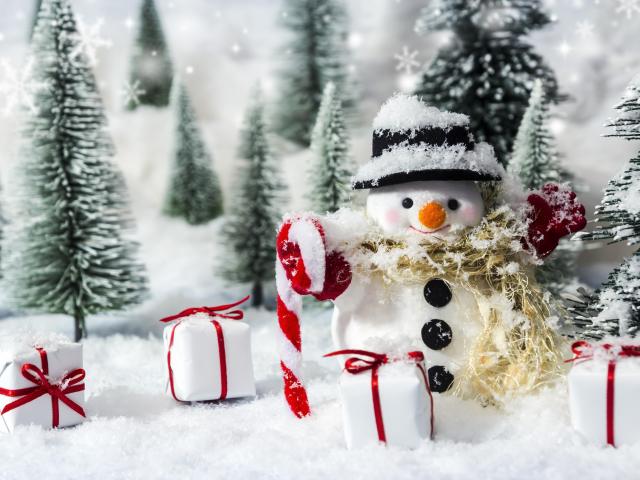 Wallpaper Snowman with gifts and Christmas trees in the snow.