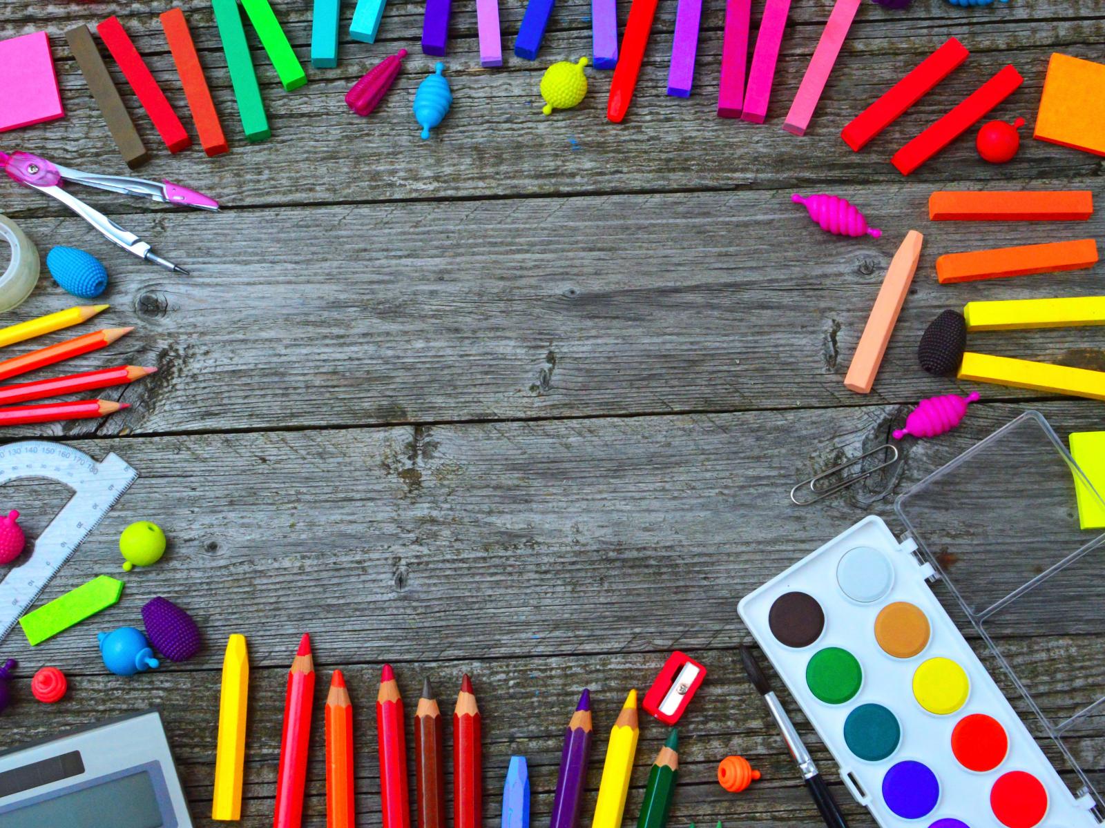 Wallpaper Rainbow of bright stationery for school on wooden table
