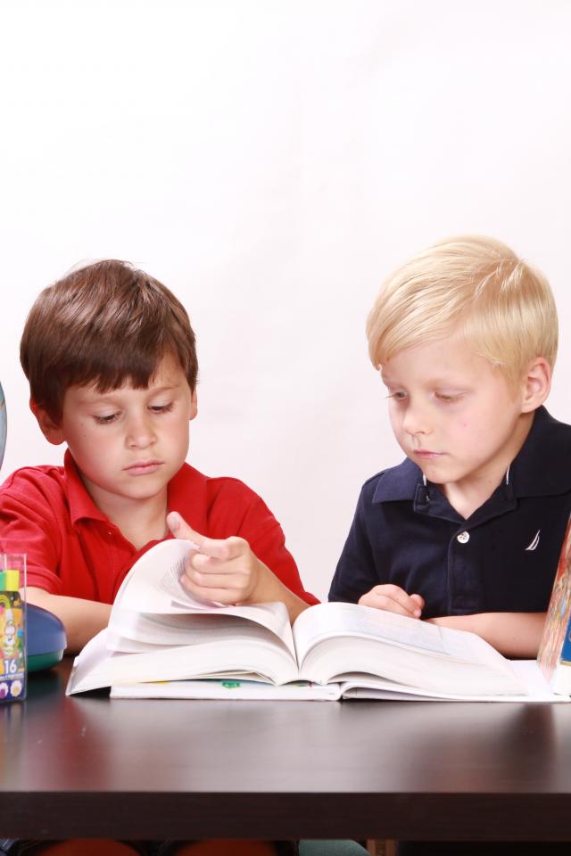 Wallpaper Two schoolboy boys with books and a globe at the table