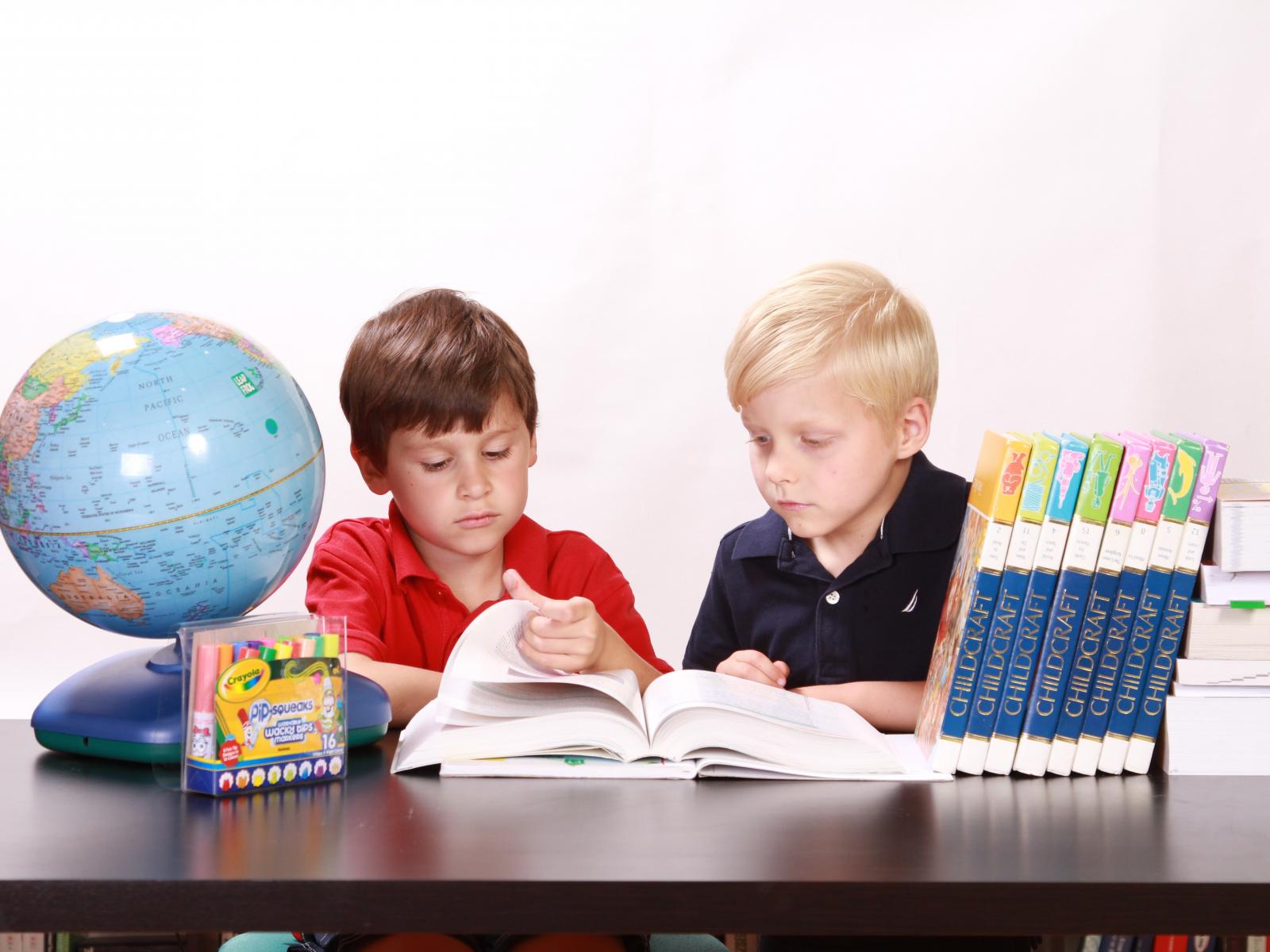 Wallpaper Two schoolboy boys with books and a globe at the table