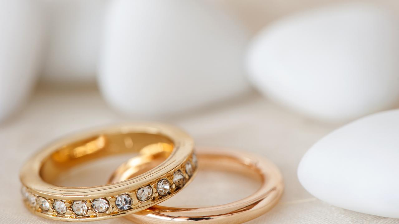 Wallpaper Two gold wedding rings on a cushion for a wedding