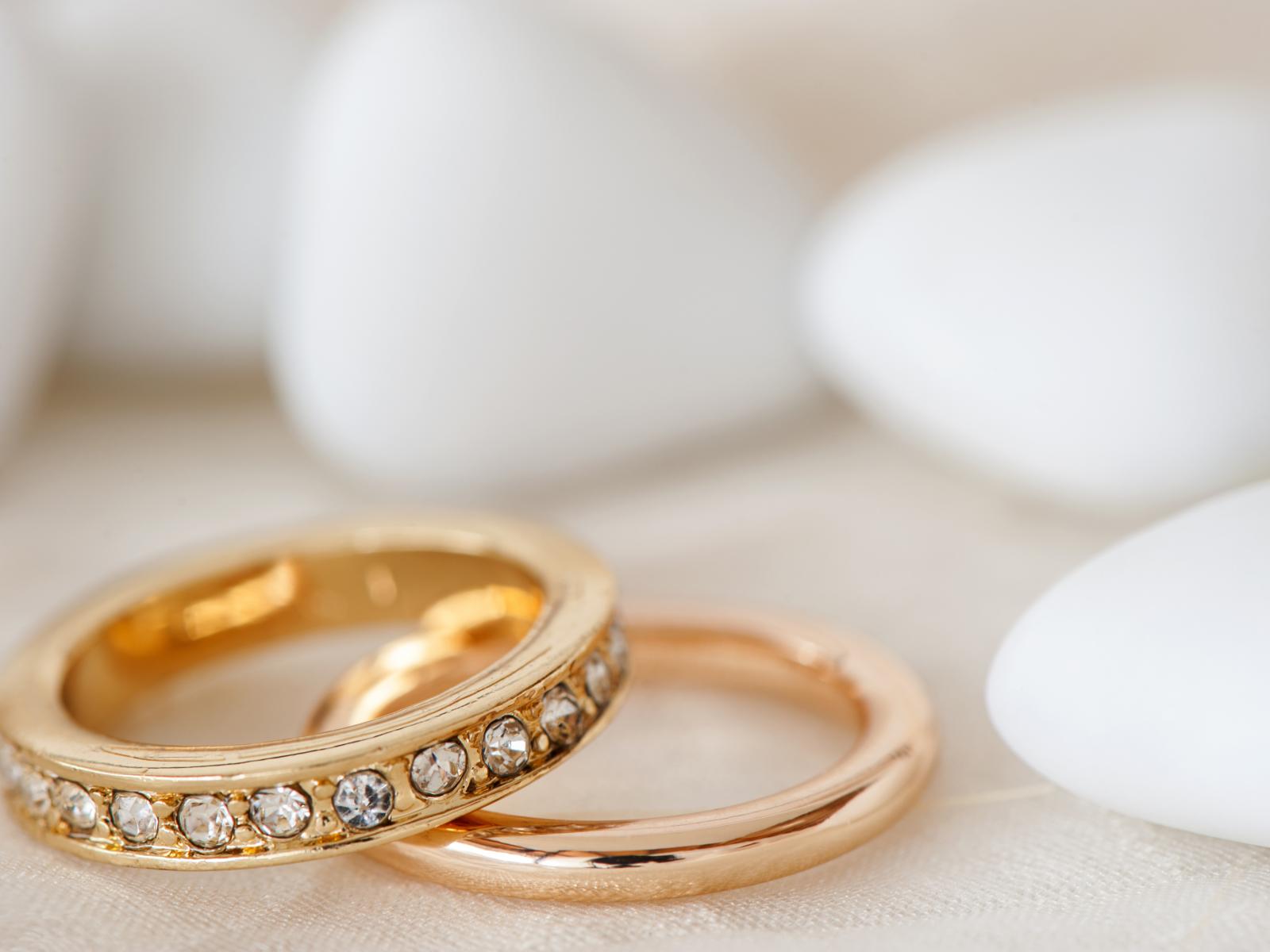 Wallpaper Two gold wedding rings on a cushion for a wedding