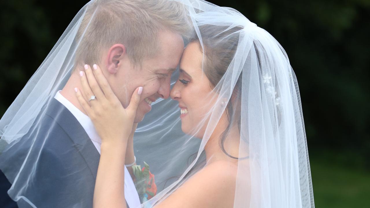 Wallpaper Bride and groom stand under a white veil