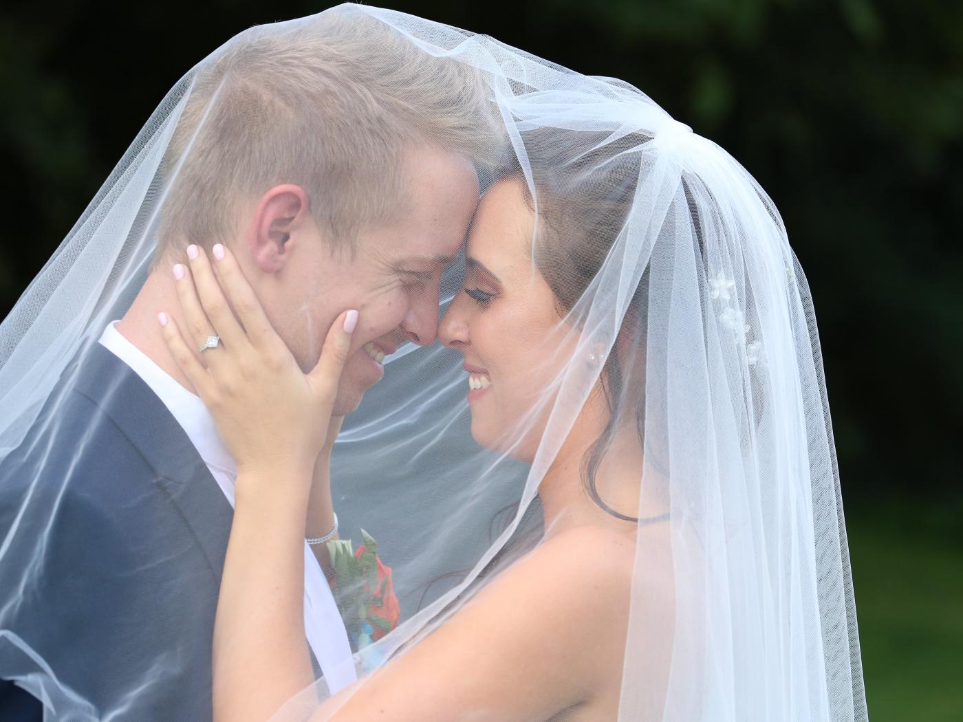 Wallpaper Bride and groom stand under a white veil