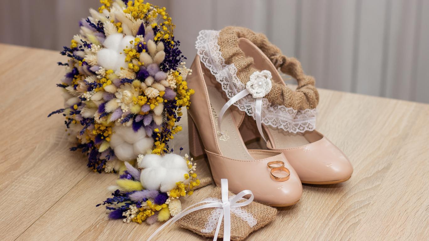 Wallpaper Bouquet of flowers, shoes and wedding rings