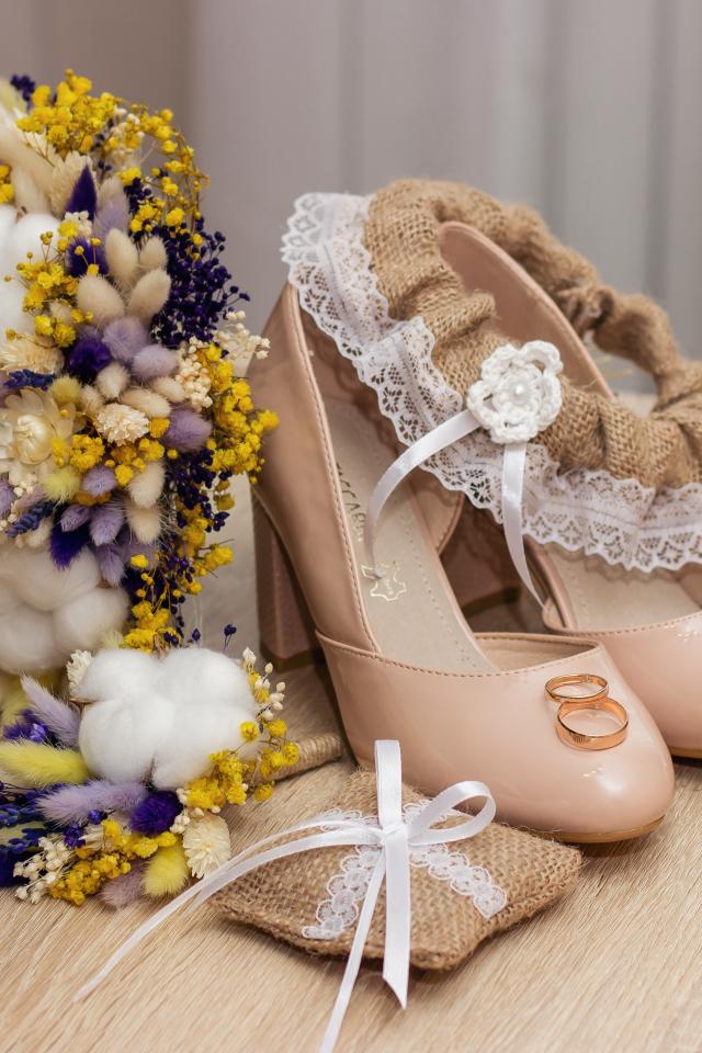 Wallpaper Bouquet of flowers, shoes and wedding rings