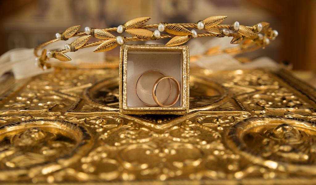 Wallpaper Two gold wedding rings in a box with a wreath