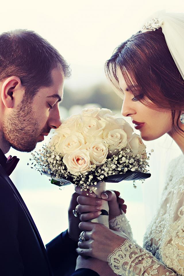 Wallpaper Bride and groom with a bouquet of white roses