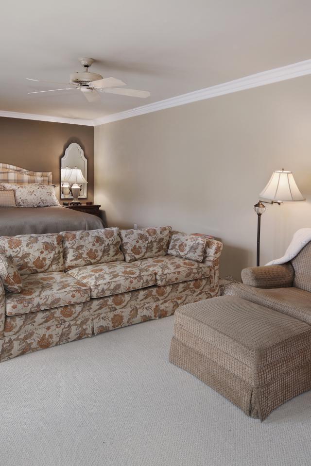 Wallpaper Gray bedroom with a bed, a sofa and an armchair