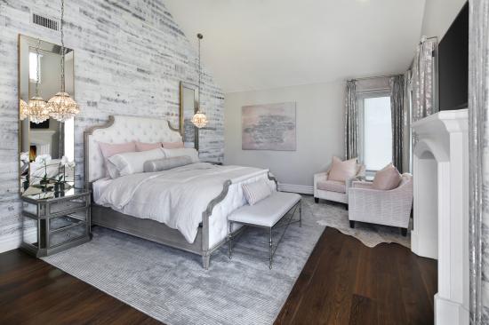 Wallpaper Large bed in a bright bedroom with fireplace