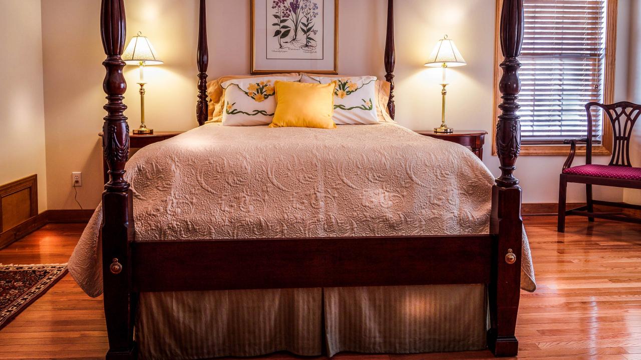 Wallpaper High bed with curtains in the bedroom in pastel colors.