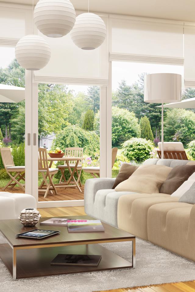 Wallpaper Spacious dining room with large windows