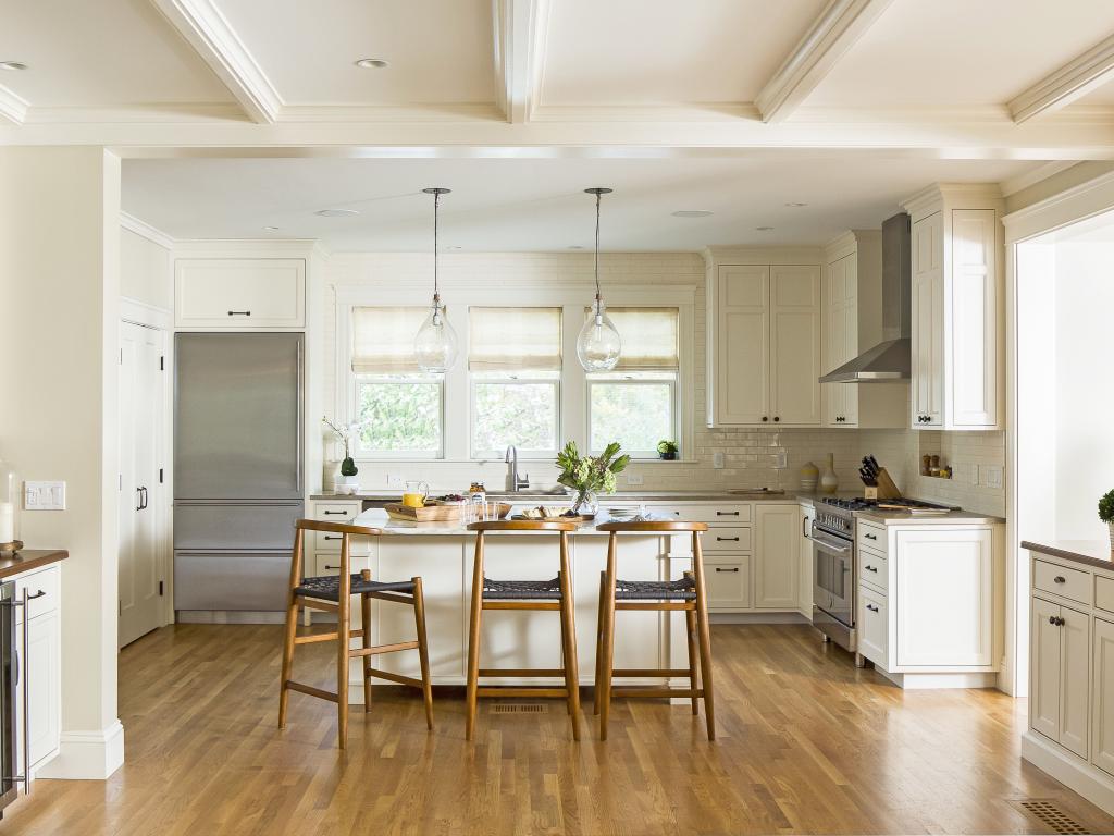 Wallpaper Spacious kitchen with wooden furniture and leather chairs