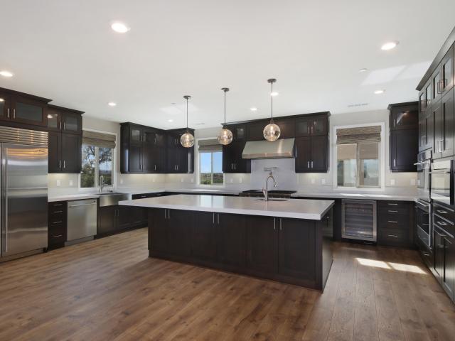 Wallpaper Large spacious kitchen with brown furniture.