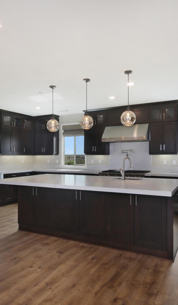 Wallpaper Large spacious kitchen with brown furniture.