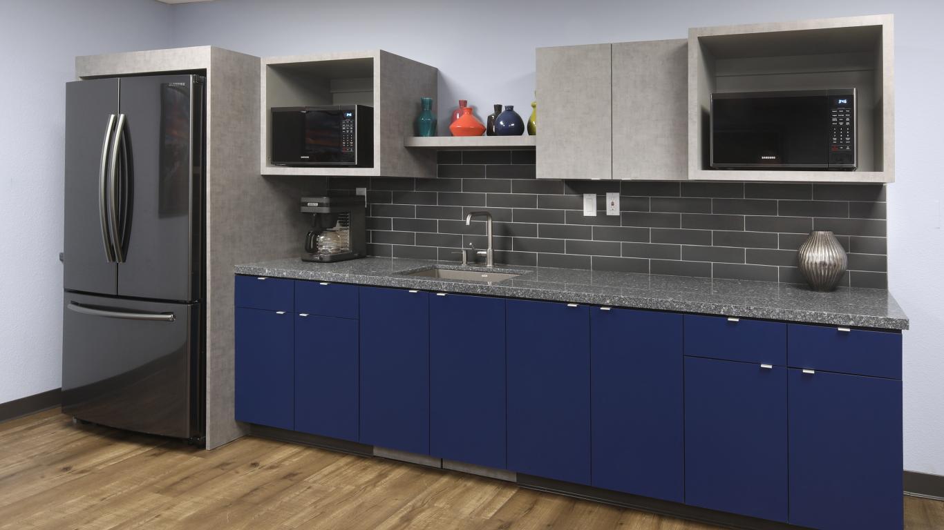 Wallpaper Blue cabinets and a large refrigerator in the kitchen