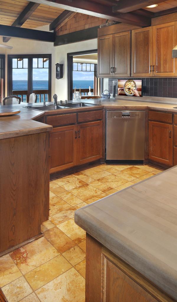 Wallpaper Wooden furniture in the kitchen with windows overlooking the sea