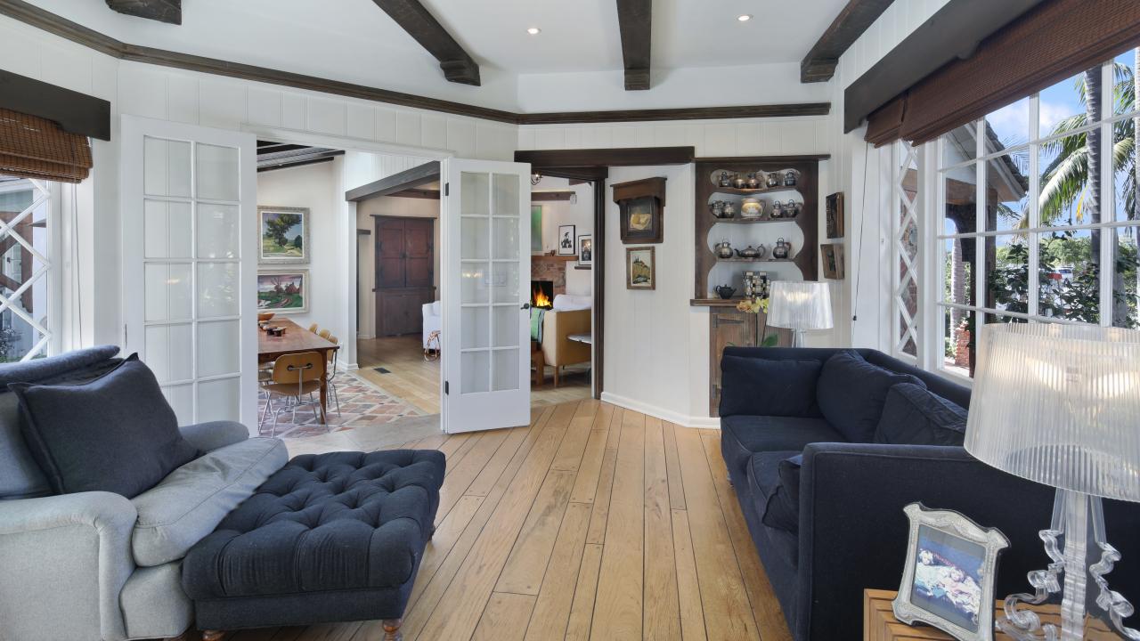 Wallpaper Living room with a large black sofa