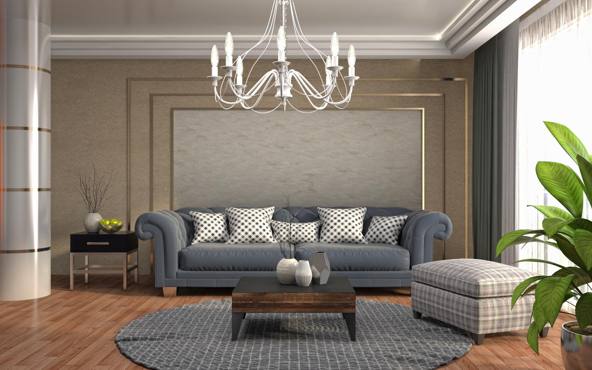 Wallpaper Living room with a large gray sofa