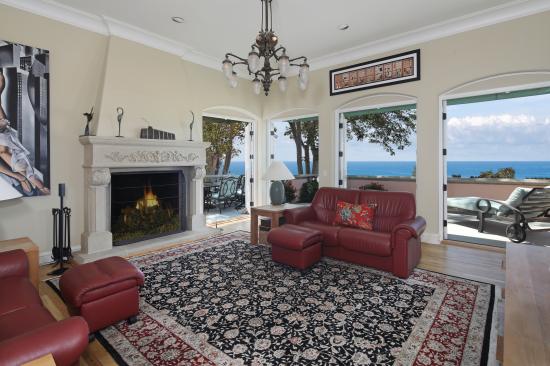 Wallpaper Living room with leather sofa, large windows and fireplace