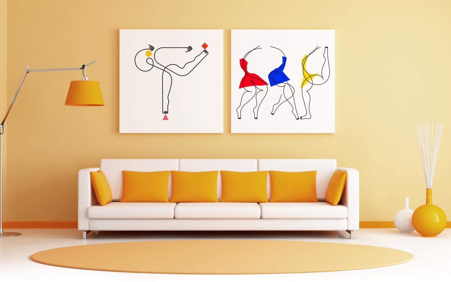 Wallpaper Unusual paintings on the wall in the room with a sofa