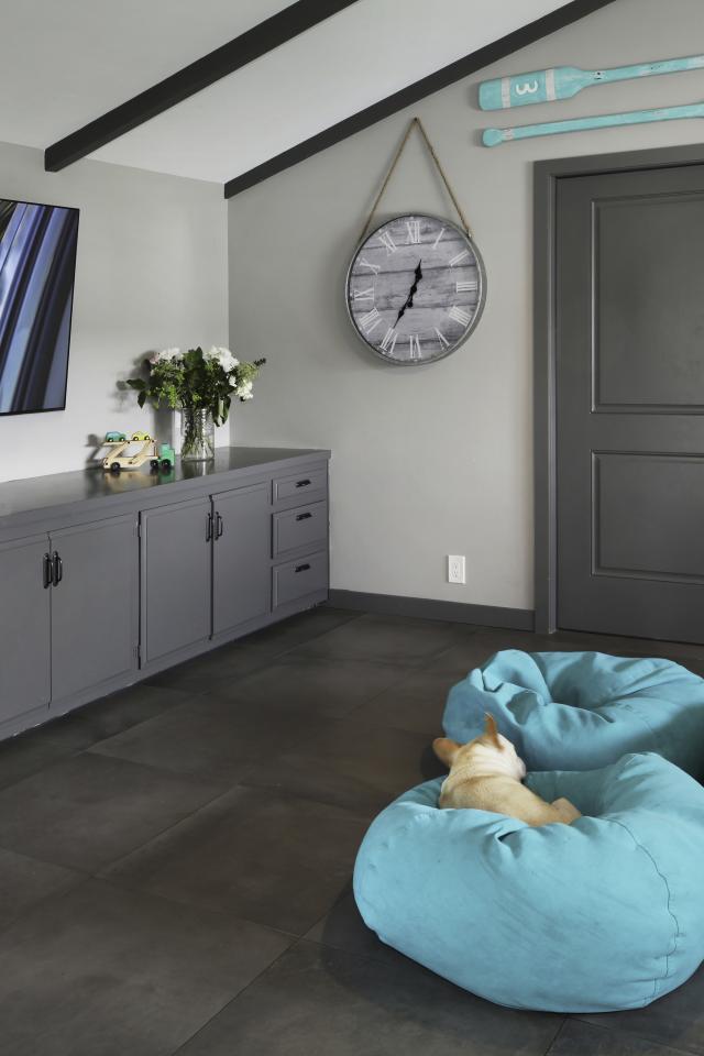 Wallpaper Blue poufs in a room with a large TV
