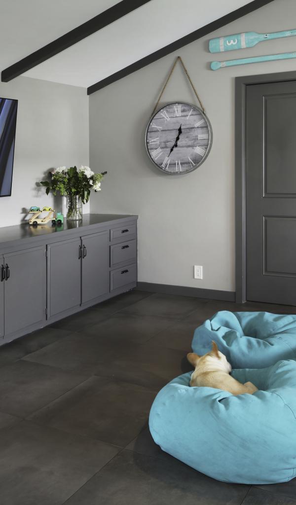 Wallpaper Blue poufs in a room with a large TV