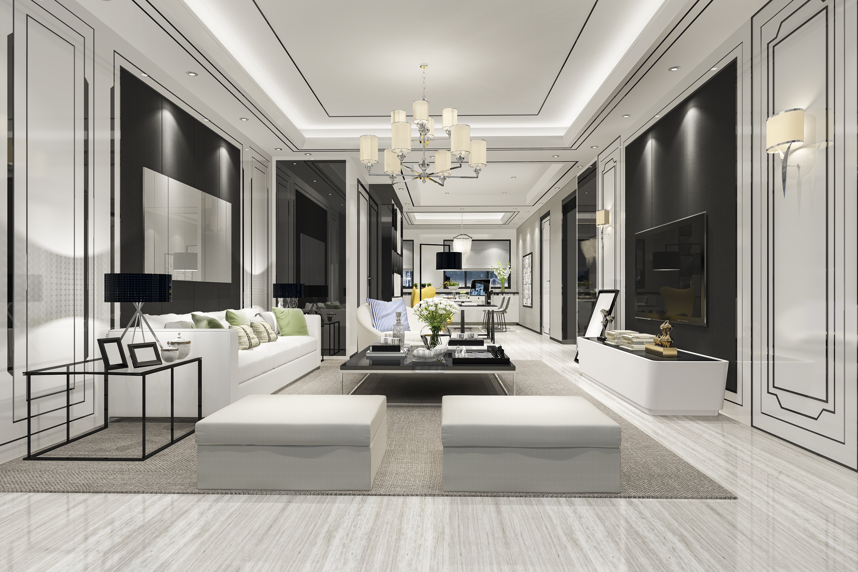 Wallpaper Large spacious living room with white leather furniture