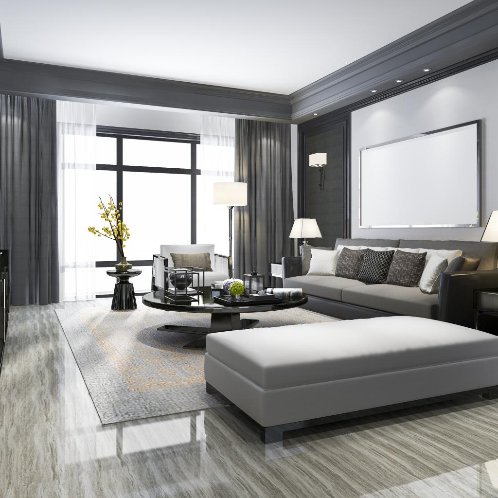 Wallpaper Gray furniture in a living room with a large window.