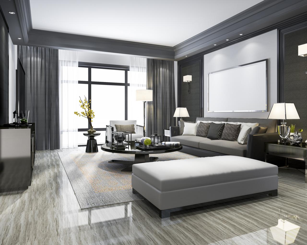 Wallpaper Gray furniture in a living room with a large window.