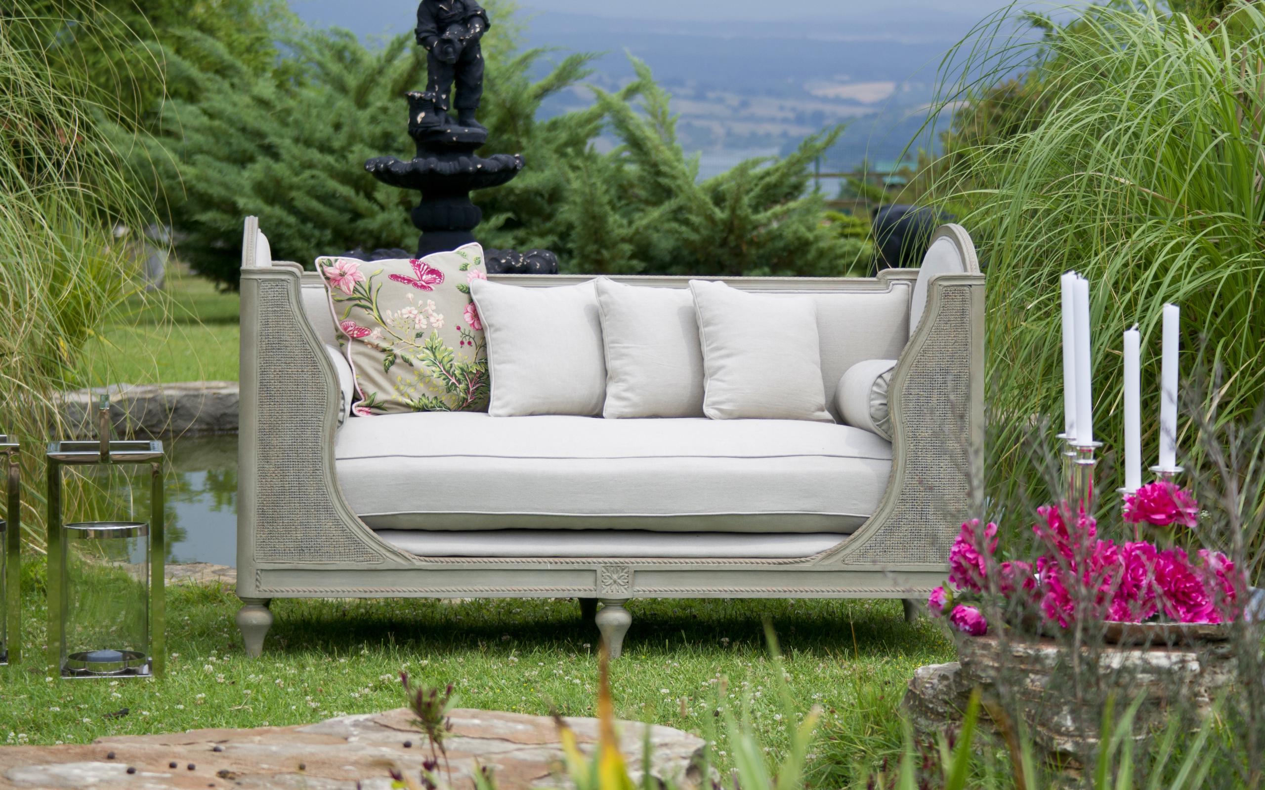 Wallpaper Large gray sofa in the garden by the pond