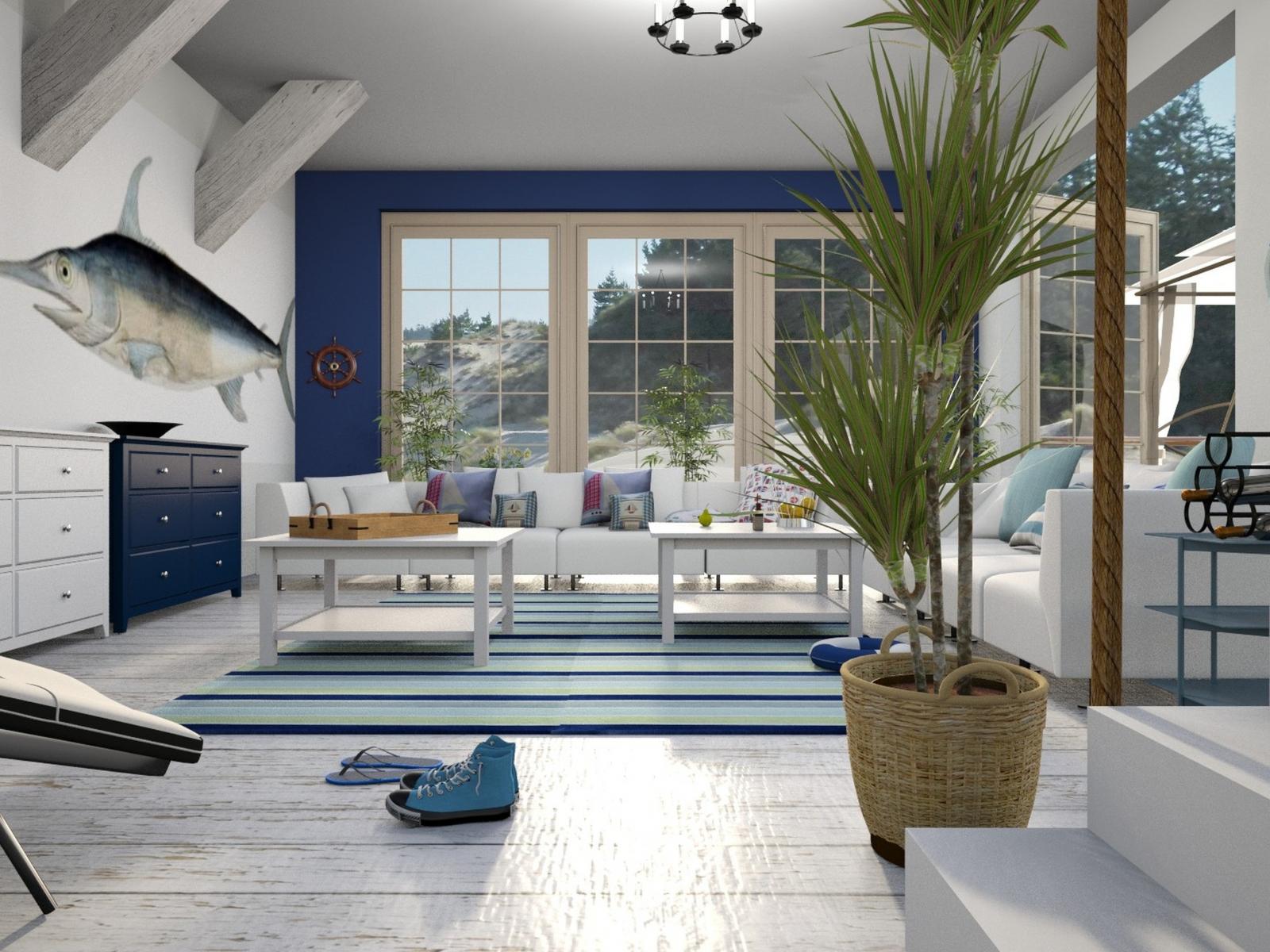 Wallpaper Large spacious living room in blue and white style