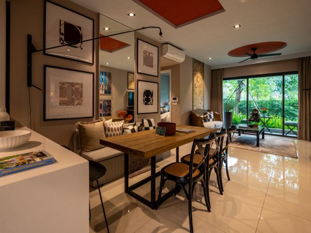 Wallpaper An oak table stands in a spacious living room