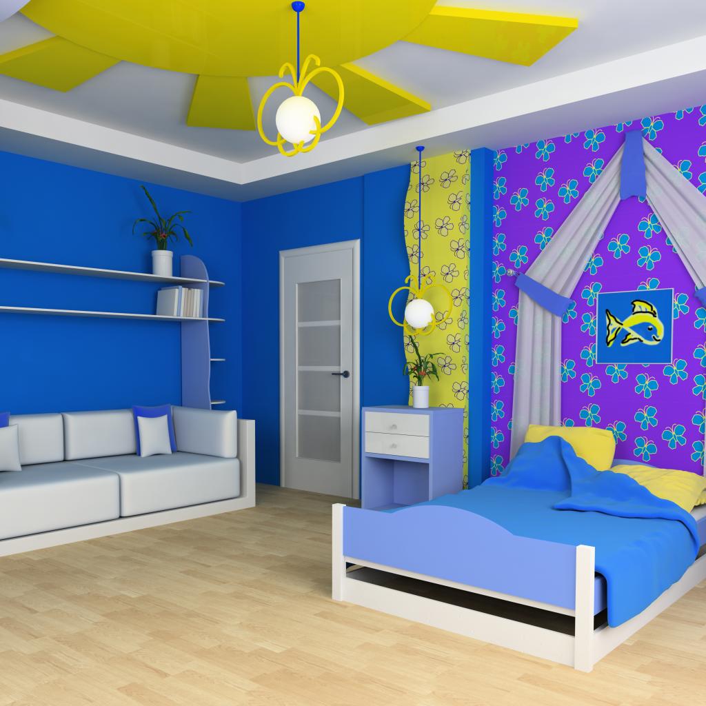 Wallpaper Beautiful children`s room with a bed and a sofa with bright blue walls