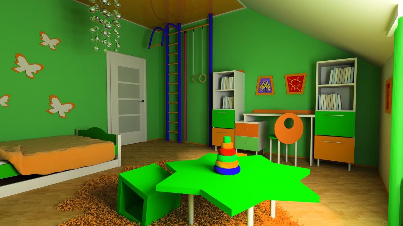 Wallpaper Children`s room with green walls and furniture