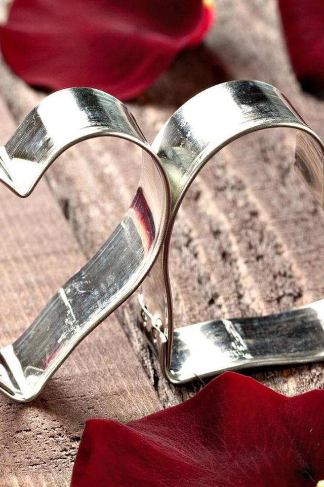 Wallpaper Two silver hearts in red rose petals
