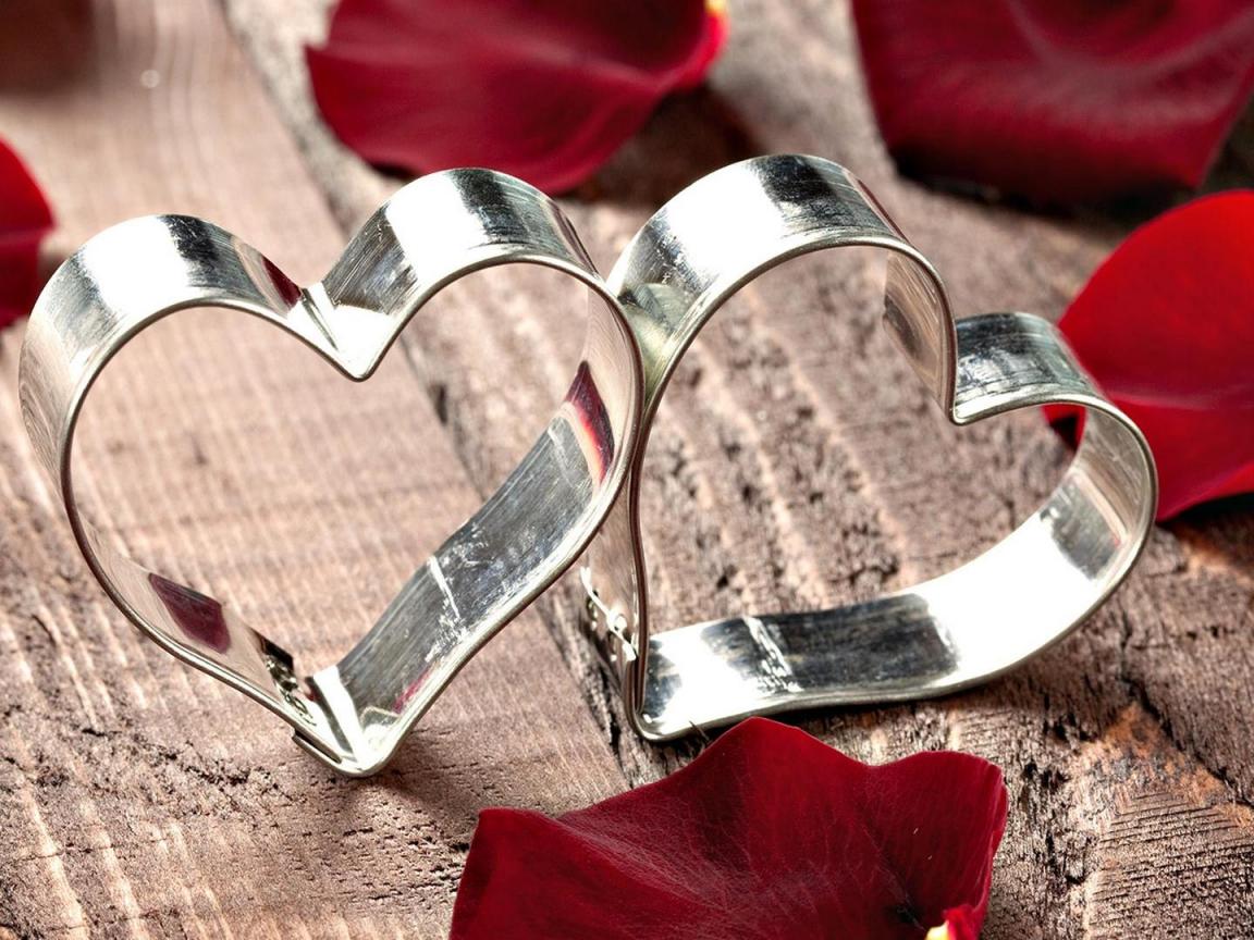 Wallpaper Two silver hearts in red rose petals